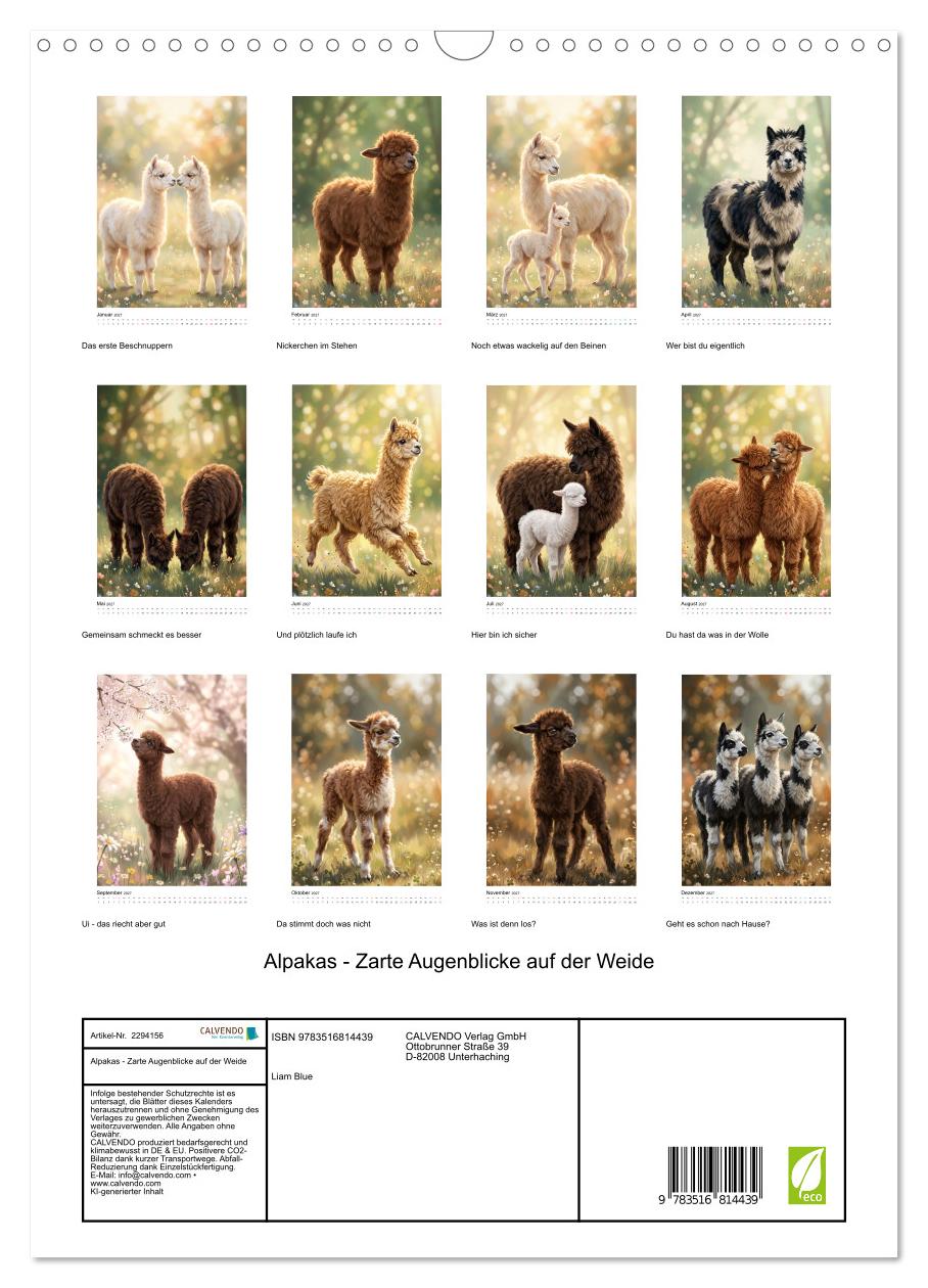 Ein Nachmittag auf der Weide – und man mochte nie wieder gehen. Alpakas sind Meister des Augenblicks: neugierig, verspielt, verschmust und manchmal einfach nur herrlich komisch. Dieser KI-generierte Wandkalender zeigt diese besonderen Tiere so, wie man sie erlebt wenn man wirklich Zeit mit ihnen verbringt – beim gegenseitigen Beschnuppern, beim wackeligen ersten Schritt des Kleinen, beim plotzlichen Sprint quer uber die Wiese und beim entspannten Dosen in der Sonne. Angelehnt an den Stil moderner impressionistischer Tierillustration verwandelt jedes Bild einen echten Moment in ein weiches, traumhaftes Kunstwerk. Fur alle, die Alpakas lieben – und alle, die es noch werden wollen.