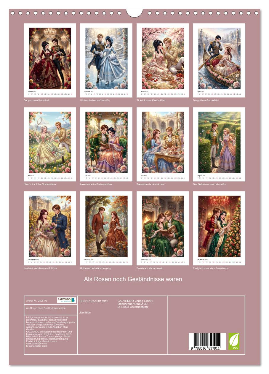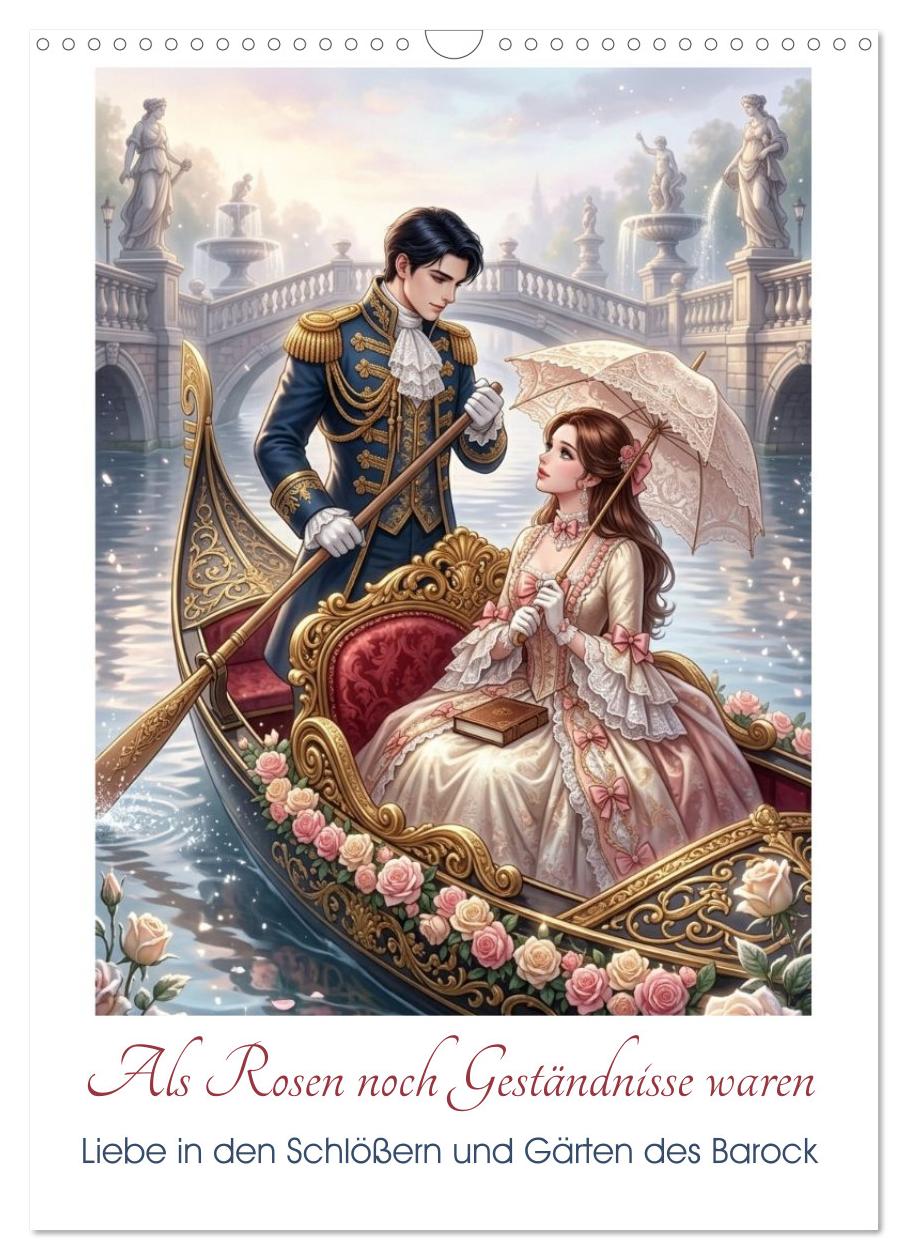Tauchen Sie ein in eine Welt aus Rosen, Seide und goldenen Augenblicken. Angelehnt an die verspielte Eleganz des europäischen Rokoko zeigt dieser Wandschmuck zwölf romantische Szenen aus einer Zeit, in der Liebe noch auf Parkettböden tanzte und Geständnisse im Duft von Rosen geflüstert wurden. Von einem Winterball im Kerzenschein über eine Gondelfahrt im goldenen Abendlicht bis zum festlichen Glanz unter dem blühenden Rosenbaum – jeder Monat erzählt seine eigene kleine Geschichte aus einer Welt voller Anmut und Sehnsucht. Die KI-generierten Illustrationen entführen Sie in prachtvolle Gärten und stimmungsvolle Interieurs des Barock, wo Samt, Spitze und Rosenduft die Kulisse für unvergessliche Begegnungen bilden.
