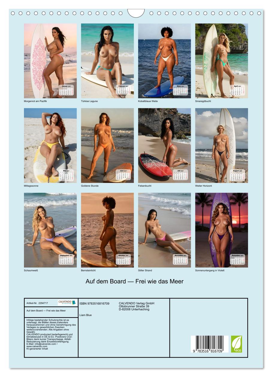 Sonne, Salzwasser und pure Schönheit – dieser KI-generierte Wandkalender verbindet Surf-Lifestyle mit erotischer Eleganz. Zwölf atemberaubende Frauen, jede einzigartig in Figur, Hautton und Ausstrahlung, präsentieren sich am Pazifik mit ihren farbenfrohen Surfboards. Vom goldenen Morgenrot bis zum glutroten Sonnenuntergang, von der türkisfarbenen Lagune bis zur einsamen Bucht – jedes Bild ist ein Fest für die Augen. Topless, selbstbewusst und frei verkörpern diese Frauen den Spirit des Surfens: ungebunden, sinnlich, unvergesslich.