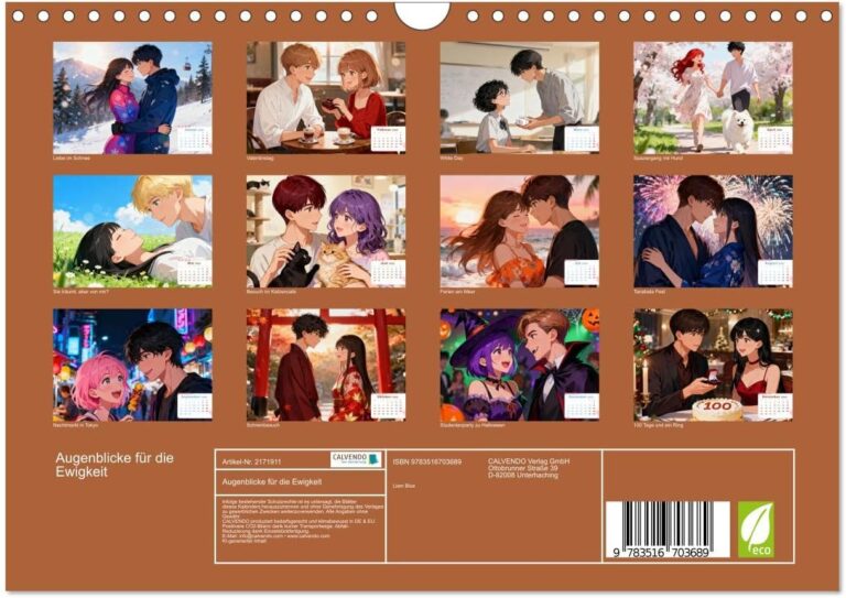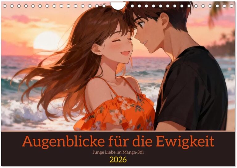 Tauche ein in die zarte Welt der Liebe. Mit unserem Kalender – Augenblicke für die Ewigkeit: Junge Liebe im Manga-Stil – begleiten dich zwölf romantische Momente durch das Jahr. Jeder Monat erzählt eine kleine Geschichte von Vertrautheit und Zuneigung, von einem Lächeln bis zu einer festlichen Umarmung. Die detailverliebten und farbenfrohen Motive sind KI generiert und fangen die Schönheit der Zweisamkeit in einem einzigartigen, gefühlvollen Stil ein. Ein bezaubernder Blickfang und das perfekte Geschenk für alle, die an die Liebe glauben.