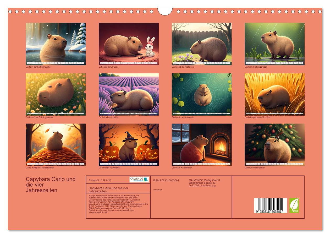 Carlo ist kein gewöhnliches Capybara – er ist das neugierigste, gemütlichste und rundlichste Tier weit und breit. Monat für Monat begleiten wir ihn durch das ganze Jahr: Im Januar wärmt er sich in der heißen Quelle, im Frühling schnuppert er an den ersten Krokussen seines Gartens, im Sommer treibt er selig im kühlen See und im Herbst thront er königlich auf einem Berg aus bunten Blättern. Diese KI-generierten Illustrationen im bunten Kawaii-Stil zeigen Carlo in leuchtenden Farben mit weichen, kuschligen Formen – jeden Monat ein neues kleines Abenteuer, das Kinder zum Staunen und Lachen bringt. Perfekt für das Kinderzimmer – und für alle, die Carlo am liebsten gleich in die Arme nehmen würden.
