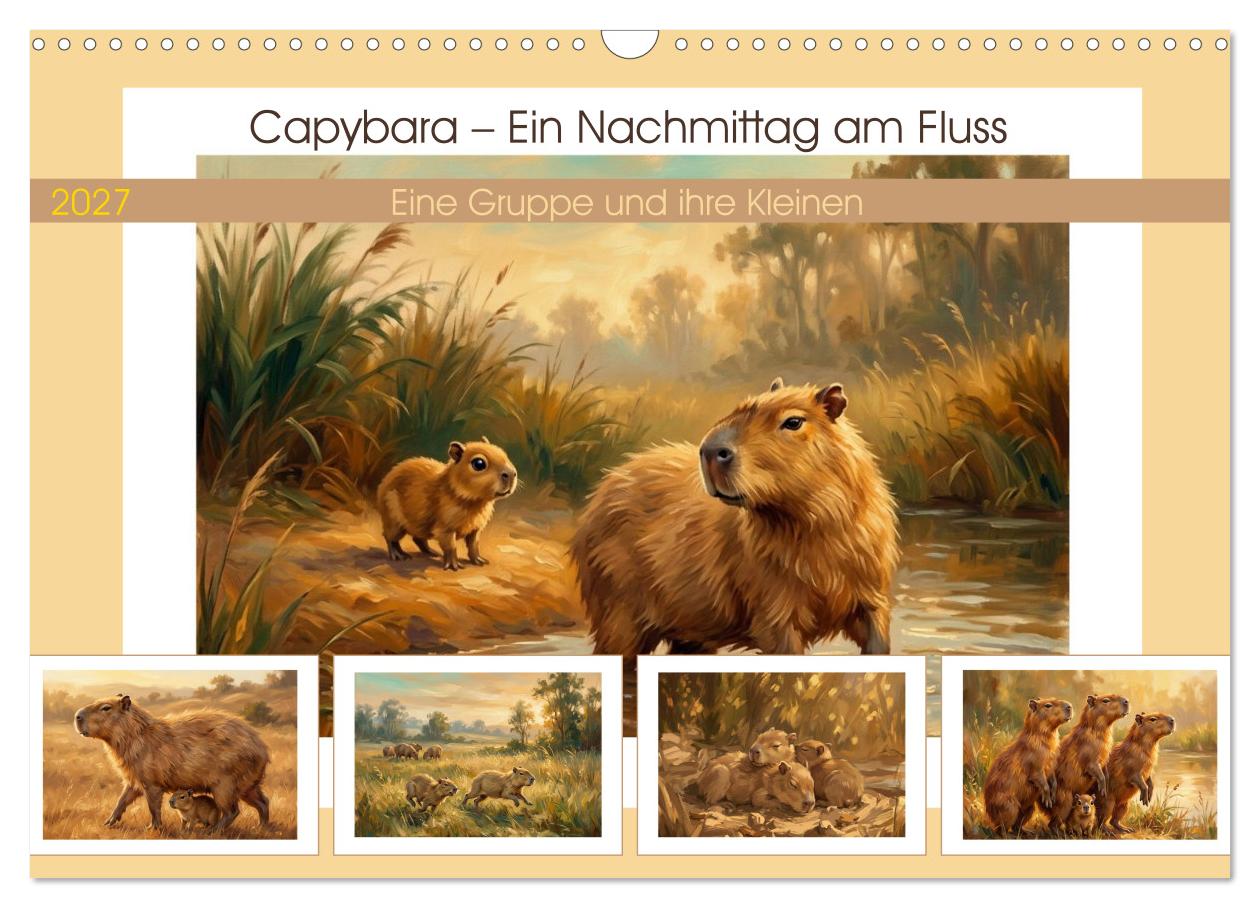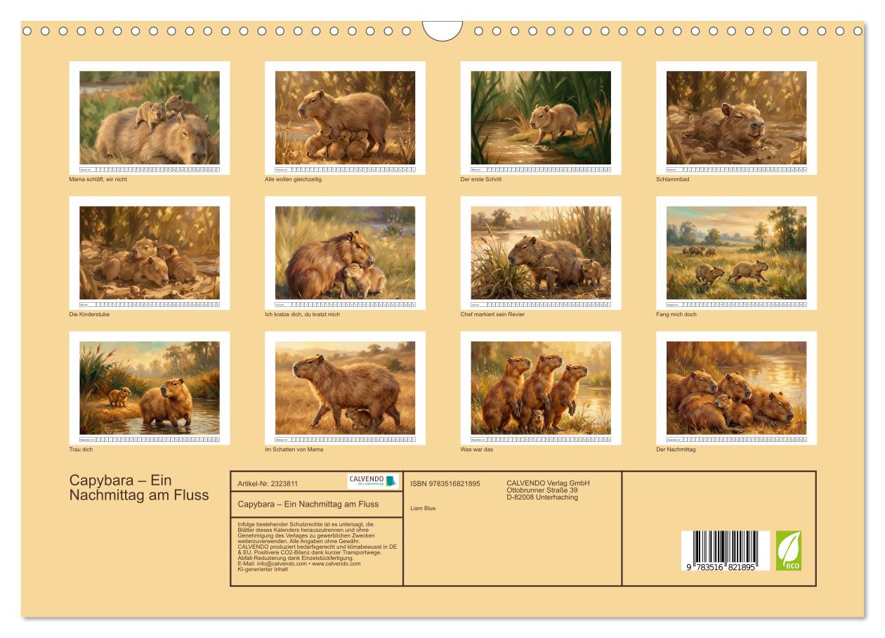 Sie leben in Gruppen von bis zu zwanzig Tieren, immer am Wasser, immer zusammen. Jede Mutter säugt alle Jungen – nicht nur ihre eigenen. Die Babys schlafen aufeinandergestapelt während die Erwachsenen fressen. Ein Kleines wagt seinen ersten Schritt ins Wasser und dreht sofort wieder um. Ein anderer rollt sich so ausdauernd im Schlamm, dass man ihn kaum noch erkennt. Dieser KI-generierte Wandkalender begleitet eine Capybara-Familie durch einen einzigen goldenen Nachmittag am Flussufer – nah dran, ruhig beobachtend, voller echter Tiermomente. Angelehnt an die impressionistische Wildtierillustration mit weichen Pinselstrichen und warmen Naturtönen. Für alle, die wissen: das Schönste passiert immer zwischen den großen Momenten.