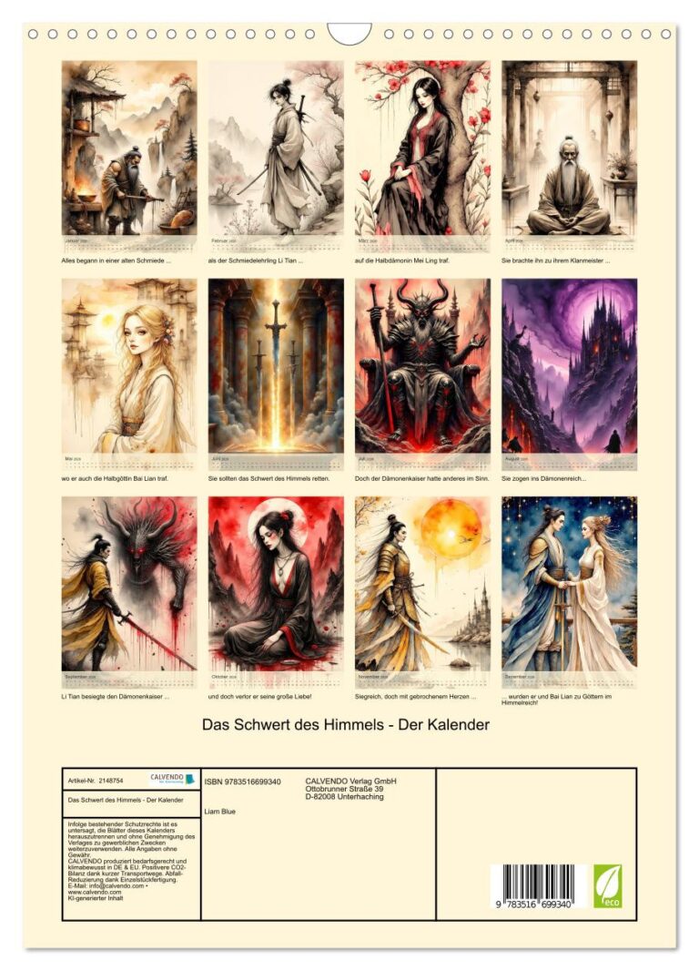 Erlebe mit – Das Schwert des Himmels – Der Kalender – eine fesselnde Xianxia-Fantasie in zwölf einzigartigen Motiven. Inspiriert vom gleichnamigen Roman aus eigener Feder, vereinen die KI-generierten Bilder Magie, Schicksal und epische Abenteuer rund um Li Tian und die Welt der Götter, Dämonenkaiser und verbotenen Reinkarnation. Monat für Monat erwartet dich ein Hauch fernöstlicher Mystik und bildgewaltige Fantasie – ein Muss für alle Liebhaber asiatischer Legenden, Magie und außergewöhnlicher Kunst.