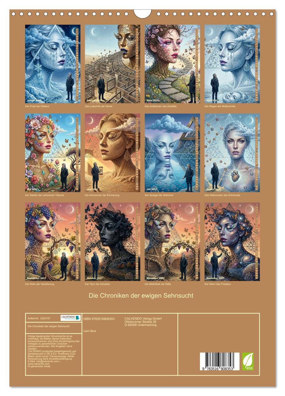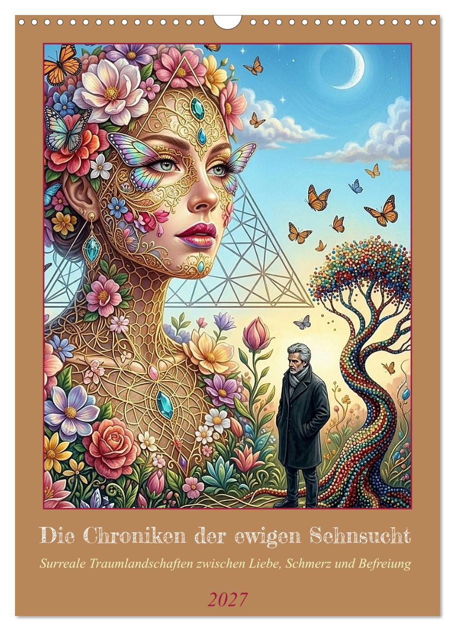 Er ist immer derselbe kleine Mann – und doch durchquert er zwölf völlig verschiedene Welten. In jedem Bild dominiert eine gigantische Frauenfigur die Landschaft: in Eis gemeißelt, aus blühenden Dornenranken geformt, in Sternenstaub aufgelöst. Sie sind nicht in weiter Ferne – sie sind überall um ihn herum. Jedes Bild erzählt von einer anderen Facette der Liebe: kältester Schmerz, zähe Sehnsucht, langsame Akzeptanz, stille Befreiung. Angelehnt an die großen Werke des Surrealismus entführt dieser KI-generierte Wandkalender in Traumlandschaften, die zwischen Wirklichkeit und Erinnerung schweben – von der eisigen Tundra über den nebligen Wald bis in den weiten Kosmos. Zwölf Bilder, die Liebe nicht beschreiben, sondern zeigen.
