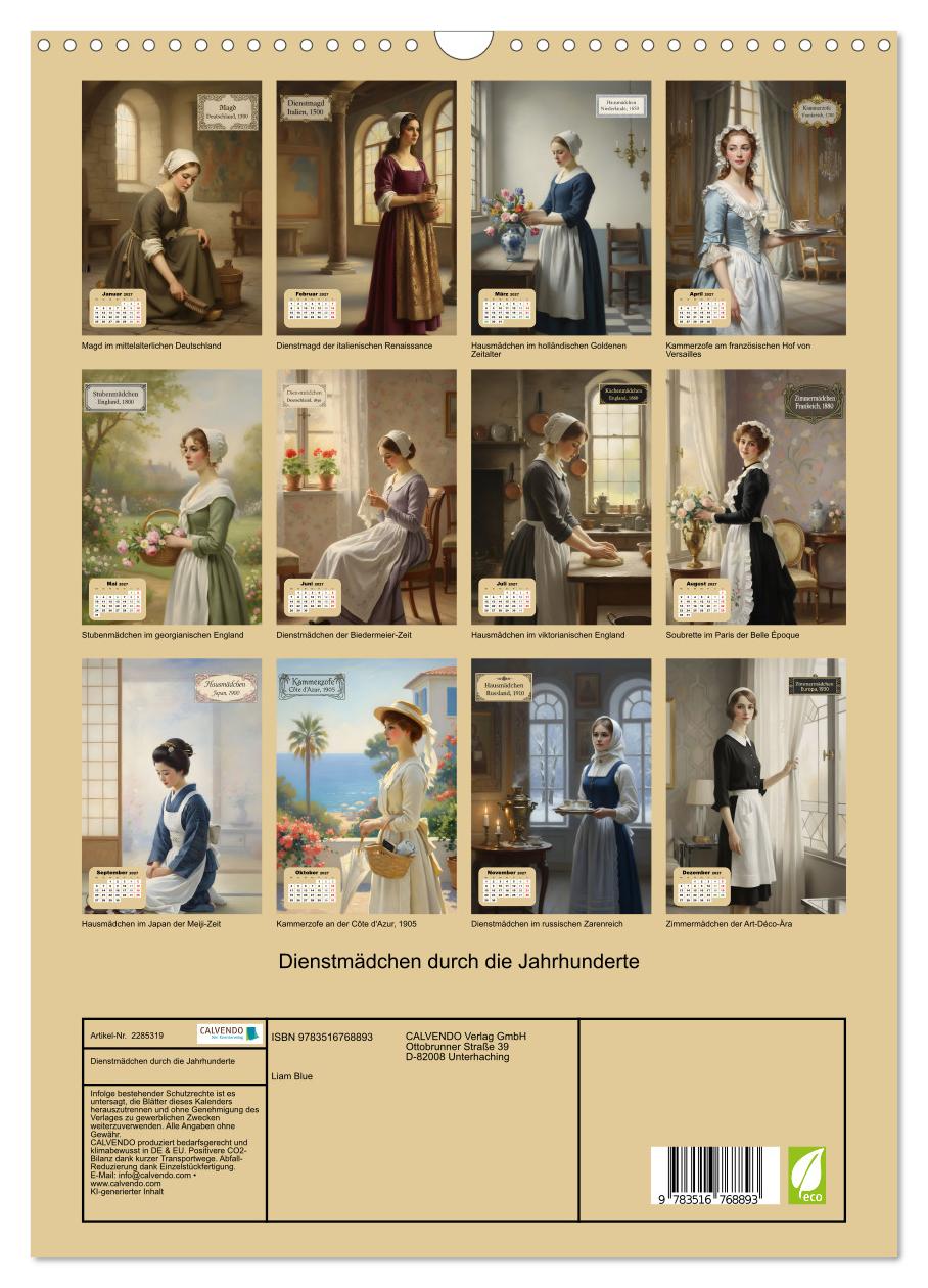 Begeben Sie sich auf eine faszinierende Reise durch sechs Jahrhunderte europäischer und asiatischer Kulturgeschichte. Dieser einzigartige Wandkalender zeigt zwölf Dienstmädchen aus verschiedenen Epochen und Ländern in authentischen historischen Uniformen – vom mittelalterlichen Deutschland über das prachtvolle Versailles bis zum Japan der Meiji-Zeit. Jedes KI-generierte Kunstwerk im romantischen Malstil vereint historische Genauigkeit mit verträumter Ästhetik und zeigt die würdevolle Schönheit dieser oft übersehenen Frauen der Geschichte. Perfekt für Geschichtsinteressierte, Liebhaber historischer Kostüme und alle, die Downton Abbey, Bridgerton oder Belle Époque schätzen – ein Kalender mit Bildungswert und künstlerischem Anspruch.