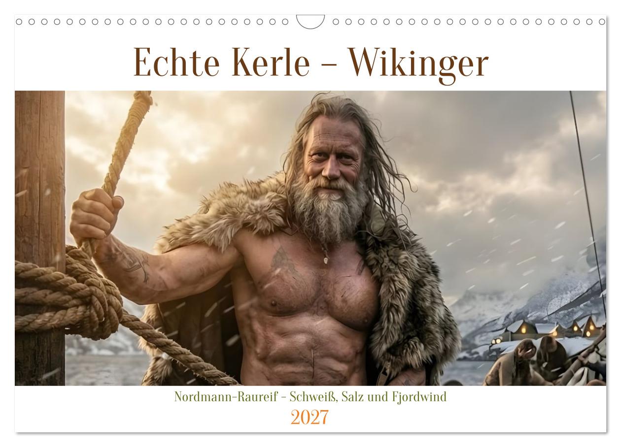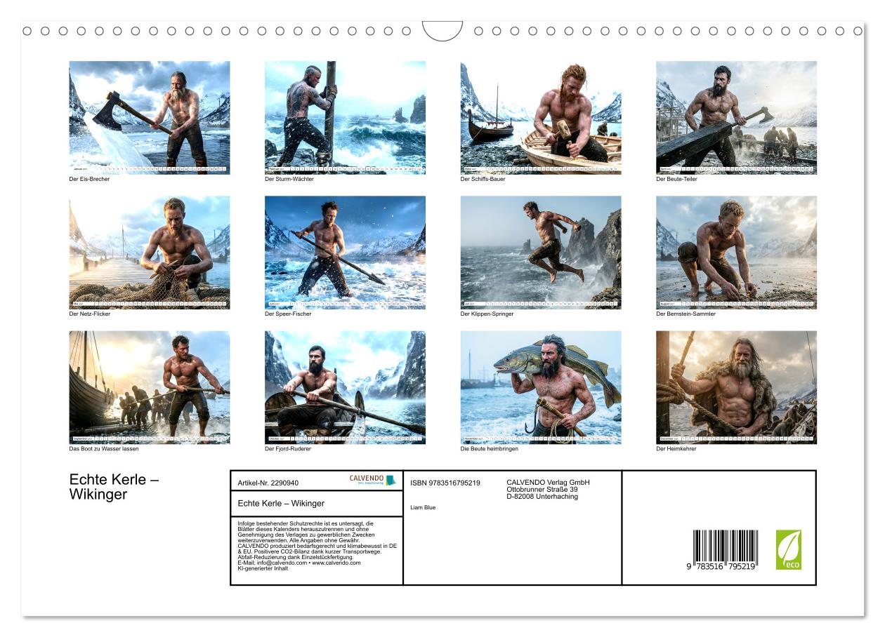 Eis schlagen, Netze flicken, Ruder ziehen – das Leben am Fjord macht keine Witze. Dieser KI-generierte Wandkalender zeigt zwölf Wikinger bei echter Arbeit: den alten Eis-Brecher, der barfuß im Fjord steht, den Sturm-Wächter, der trotzend in den Schneesturm blickt, den Schiffs-Bauer, der im schwachen Frühlingslicht seinen Rumpf zusammenschlägt. Kein Held posiert hier – jeder dieser Männer schwitzt, stemmt sich gegen Seil oder Welle, haut Salz aus dem Boden oder ritzt Runen in nassen Stein. Cineastisch beleuchtet, jeder Monat ein anderes Licht, ein anderes Wetter, ein anderer Charakter. Für alle, die echte Männlichkeit ohne Glitzer schätzen.