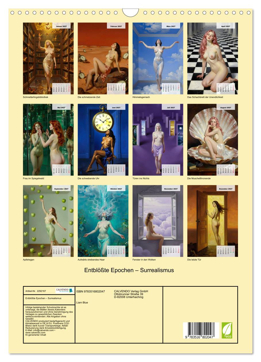 In den Träumen der Surrealisten begegnet man Frauen, die keine Grenzen kennen — weder die der Schwerkraft, noch die der Logik, noch die der Zeit. Dieser KI-generierte Kalender zeigt zwölf Frauenakte angelehnt an die große Tradition des Surrealismus: Frauen in unmöglichen Bibliotheken, in Räumen aus Wolken, in Irrgärten aus Spiegeln, vor schwebenden Uhren, zwischen Türen in andere Welten und zwischen schwebenden Äpfeln. Inspiriert von der Bildwelt eines Paul Delvaux, Salvador Dalí und René Magritte — keine historische Reproduktion, sondern eine künstlerische Hommage an eine Epoche, die den Traum zur höchsten Form der Wahrheit erklärte.