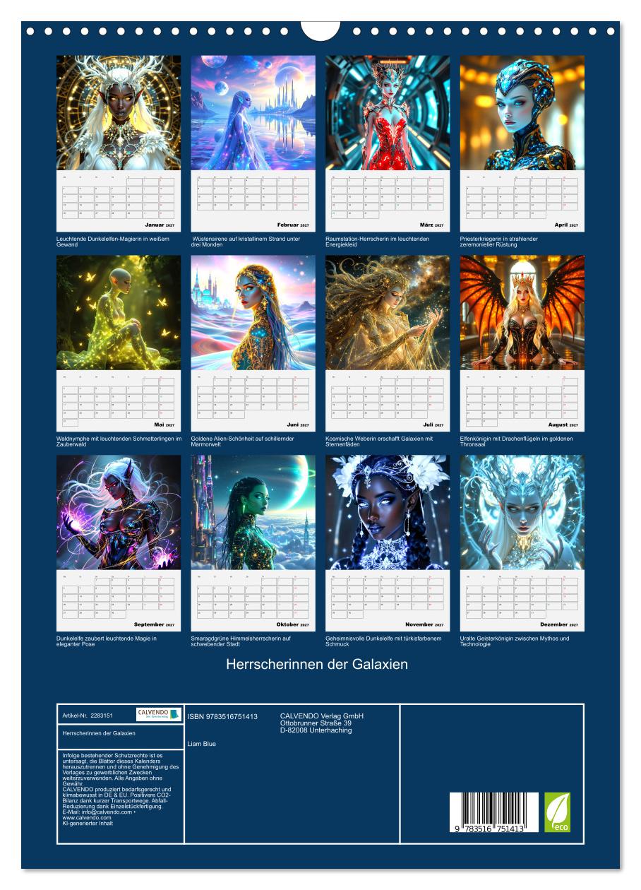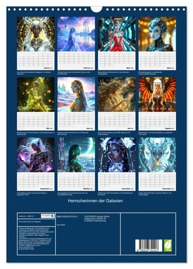 Tauchen Sie ein in eine Welt jenseits unserer Vorstellungskraft! Dieser außergewöhnliche Wandschmuck präsentiert zwölf atemberaubende Herrscherinnen aus den entlegensten Winkeln des Universums. Jedes Motiv wurde aufwendig KI-generiert und zeigt leuchtende Schönheiten in prächtigen Gewändern, schimmernden Rüstungen und magischen Landschaften, die Ihrer Fantasie Flügel verleihen. Von der geheimnisvollen Dunkelelfen-Magierin im leuchtenden Gewand über die Wüstensirene auf kristallinem Strand bis hin zur kosmischen Weberin, die Galaxien zwischen ihren Fingern entstehen lässt – jede Königin erzählt ihre eigene faszinierende Geschichte. Die detailreichen Darstellungen verschmelzen mystische Elemente mit futuristischer Ästhetik und schaffen eine einzigartige Atmosphäre zwischen Traum und Wirklichkeit.