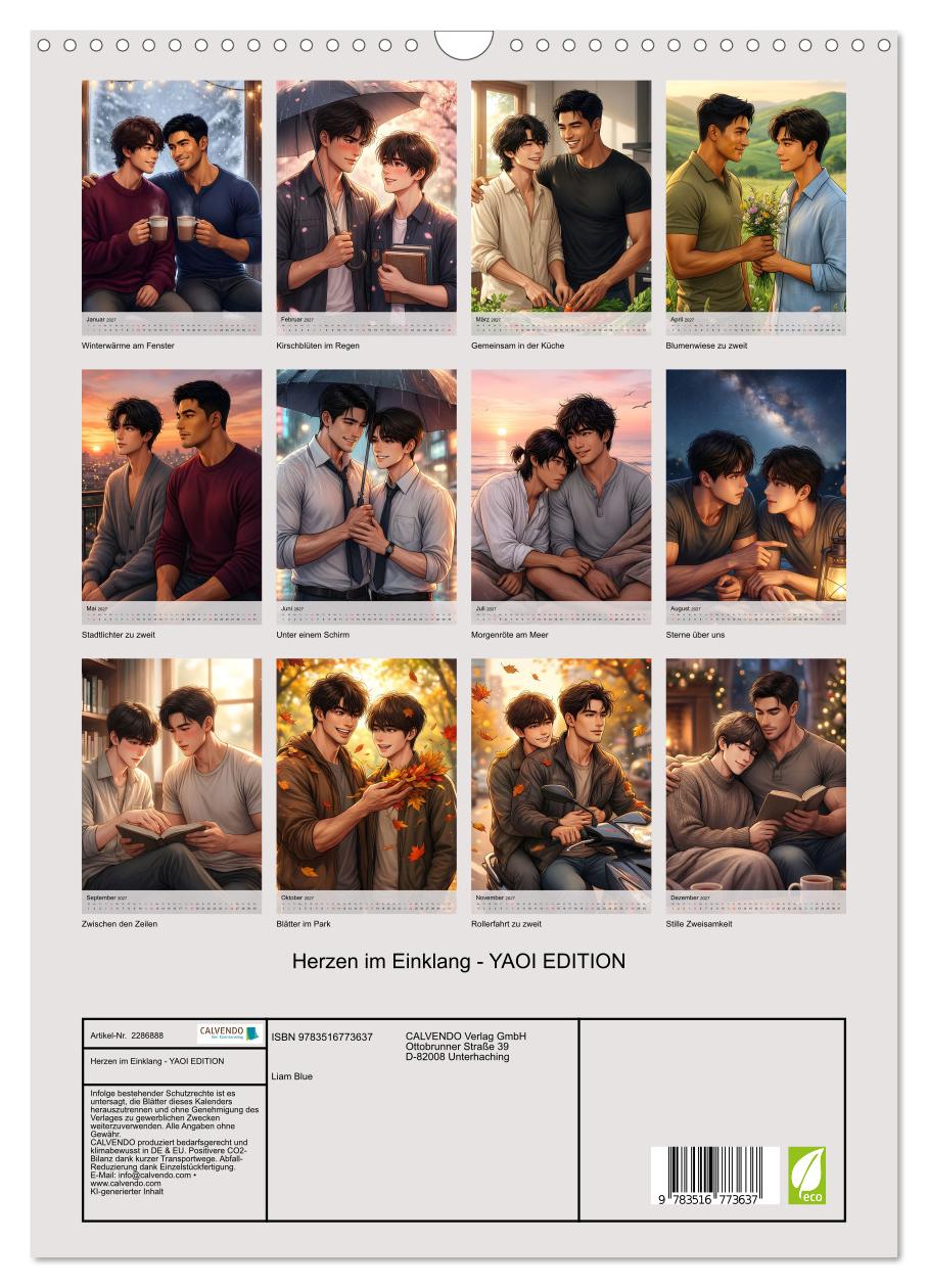 Erleben Sie zwölf wunderschöne Begegnungen zwischen Männern, die sich lieben. Dieser KI-generierte Wandschmuck im modernen Manga-Stil zeigt romantische Augenblicke voller Zärtlichkeit und tiefer Verbundenheit. Von verschneiten Winterabenden über sonnige Frühlingstage bis zu goldenen Herbstmomenten begleiten Sie verschiedene Paare durch alle Jahreszeiten. Jeder Monat erzählt eine eigene Geschichte: die beschützende Umarmung im Regen, der verliebte Blick beim gemeinsamen Kochen, stille Zweisamkeit unterm Sternenhimmel. Die liebevoll gestalteten Illustrationen fangen die Magie echter Zuneigung ein und zeigen Liebe in ihrer schönsten Form. Perfekt für alle, die Romantik zwischen Männern schätzen und sich an authentischer Darstellung queerer Beziehungen erfreuen.