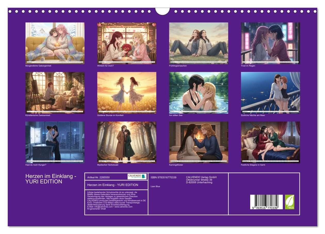 Erleben Sie zwölf wunderschöne Begegnungen zwischen Frauen, die sich lieben. Dieser KI-generierte Wandschmuck im modernen Anime-Stil zeigt romantische Augenblicke voller Zärtlichkeit und tiefer Verbundenheit. Von kuscheligen Wintermorgen über verträumte Frühlingswiesen bis zu stürmischen Herbsttagen begleiten Sie verschiedene Paare durch alle Jahreszeiten. Jeder Monat erzählt eine eigene Geschichte: das scheue erste Treffen im Regen, die fürsorgliche Geste nach einem Spaziergang, der verliebte Blick bei Sonnenuntergang. Die liebevoll gestalteten Illustrationen fangen die Magie echter Zuneigung ein und zeigen Liebe in ihrer schönsten Form. Perfekt für alle, die Romantik zwischen Frauen schätzen und sich an authentischer Darstellung queerer Beziehungen erfreuen. Ein Kalender der Herzen berührt und das ganze Jahr über Freude schenkt.
