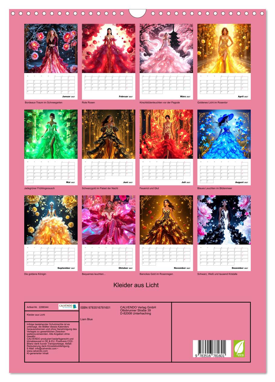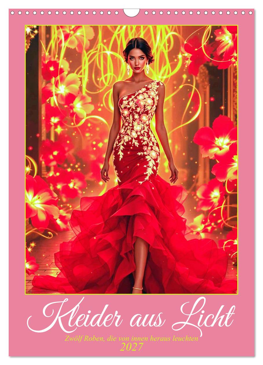 Zwölf Roben, die nicht schimmern – sie leuchten. Dieser KI-generierte Wandkalender zeigt Traumkleider der besonderen Art: Jedes Gewand trägt sein Licht in sich, als wäre Magie in Seide und Organza eingewoben. Von der samtenen Bordeaux-Robe im verschneiten Wintergarten über ein kirschblütenpinkes Kleid vor einer japanischen Pagode bis zur feuerrot glühenden Robe im goldenen Palast – jeder Monat entfaltet eine eigene Farbwelt voller Glanz und Dramatik. Leuchtende Grüntöne des Frühlings, strahlende Gelbtöne des Sommers, schwarz-goldene Pracht des Herbstes und kristallklares Weiß des Winters: Diese Kleider sind keine Mode – sie sind Lichtkunst. Ein Wandschmuck für alle, die Schönheit, Farbe und magische Ausstrahlung lieben.