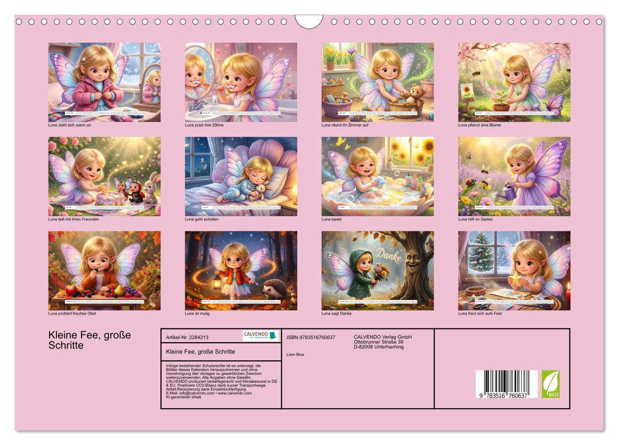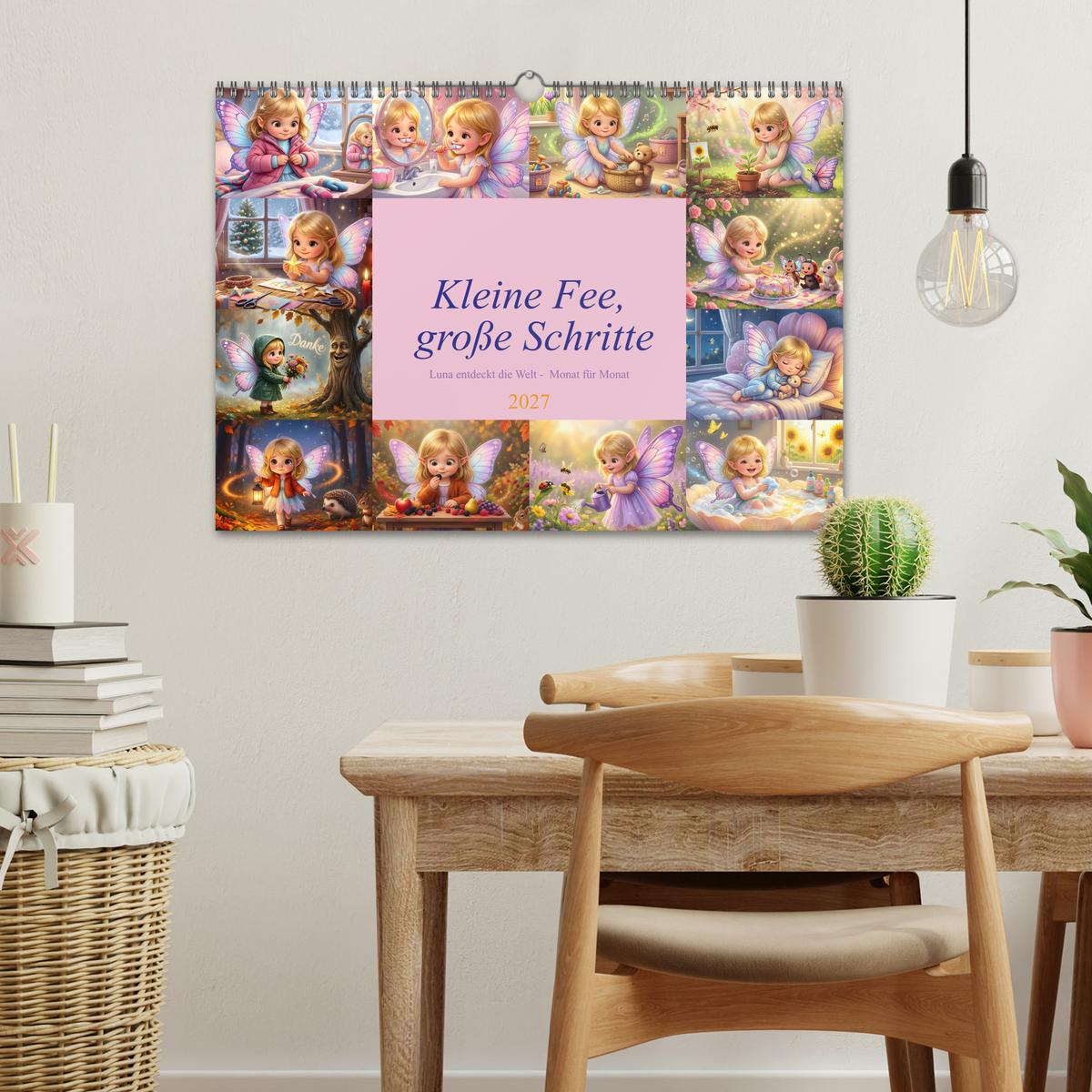 Begleite Luna die Fee durch ein zauberhaftes Jahr! Monat für Monat macht sie wichtige Schritte: vom Anziehen im Winter über Zähneputzen, Aufräumen und Teilen mit Freunden bis zum Überwinden von Ängsten. Dieser KI-generierte Kalender verbindet die magische Feenwelt mit spielerischem Lernen und macht Selbstständigkeit zum Abenteuer. Luna wird zur Begleiterin und zum Vorbild für Kinder, die stolz sagen: “Das kann ich auch!” Montessori-inspiriert fördert jedes Monatsbild eine wichtige Alltagskompetenz und unterstützt Eltern dabei, Routinen mit Freude zu etablieren. Die in zarten Pastellfarben gehaltenen Illustrationen schaffen magische Atmosphäre im Kinderzimmer. Perfekt für Kinder von 3 bis 6 Jahren – kleine Feen, die große Schritte machen möchten.
