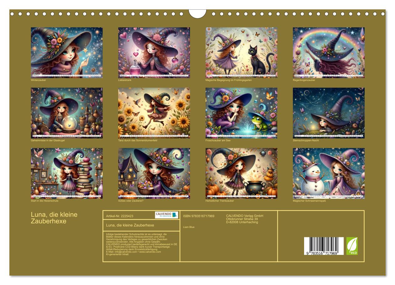 Entdecke eine bunte Welt voller Magie und Abenteuer mit Luna, der kleinen Zauberhexe! Zwölf liebevoll ki-generierte Motive führen durch das ganze Jahr und begeistern kleine Hexenfreunde jeden Monat aufs Neue. Mal trifft Luna eine neugierige schwarze Katze, mal entdeckt sie das Geheimnis einer Glaskugel oder braut einen geheimnisvollen Zaubertrank. Die niedlichen und fantasievollen Illustrationen machen jeden Monat zu einem ganz besonderen Erlebnis. Ideal zum Träumen, Lachen und Staunen – dieser Hexenzauber begleitet dich voller Freude durch alle Jahreszeiten.
