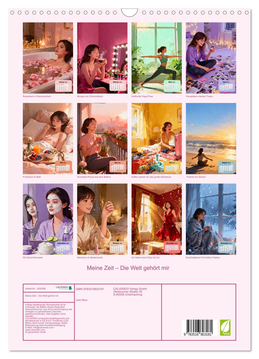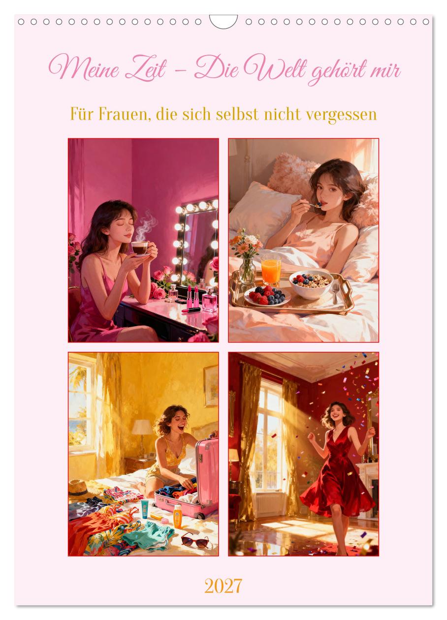 Du bist gut so wie du bist – und trotzdem darf das Leben immer ein bisschen schöner, bewusster und voller werden. Dieser KI-generierte Wandschmuck zeigt zwölf warme, glitzernde Momente weiblicher Selbstfürsorge: ein entspannendes Rosenbad im Kerzenschein, kraftvolles Yoga im Morgengrauen, ein selbstbewusster Blick in den Spiegel mit dem neuen Lieblingsoutfit, tanzend allein in der eigenen Wohnung – einfach weil das Leben schön ist. Jedes Bild ist eine Einladung, dir selbst Gutes zu tun, deine Träume ernst zu nehmen und jeden Monat einen Moment zu schaffen, der nur dir gehört. Rosa, warm und voller Glanz – für alle jungen Frauen, die das Beste aus sich herausholen wollen.