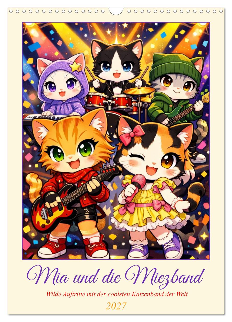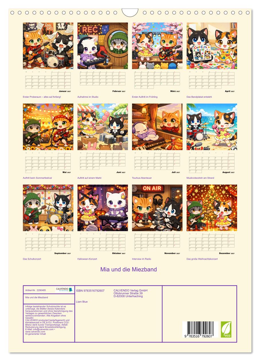 Vorhang auf für die coolste Band der Welt! Mia, Felix, Luna, Bruno und Bella sind fünf unzertrennliche Kätzchen mit einem großen Traum: Sie wollen Rockstars werden! Dieser KI-generierte Kinderkalender begleitet die Miezband durch ihr aufregendes erstes Jahr – vom chaotischen ersten Proberaum im Januar bis zum großen funkelnden Weihnachtskonzert im Dezember. Jeden Monat erwartet die fünf Freunde ein neues Abenteuer: das erste Musikvideo am Strand, der Auftritt auf dem Sommerfestival, das nervöse Schulkonzert oder das gruselige Halloween-Konzert. Die farbenfrohen 3D-Kawaii-Illustrationen zeigen immer dieselben fünf liebevoll gestalteten Charaktere in neuen, witzigen Situationen. Perfekt für kleine Musikfans von 3 bis 8 Jahren!