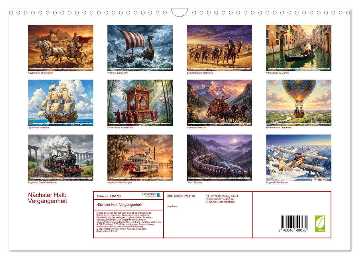 Was wäre, wenn jede Reise eine Zeitreise wäre? Dieser KI-generierte Wandkalender entführt Sie in zwölf Epochen der Menschheitsgeschichte – und zeigt, wie die Welt sich bewegte, bevor es Autobahnen und Flughäfen gab. Jeder Monat präsentiert ein legendäres Fortbewegungsmittel seiner Zeit: Der ägyptische Streitwagen rast durch Wüstensand, das Wikinger-Langschiff bricht durch Sturmwellen, der Orient Express schlängelt sich durch nächtliche Bergwelten. Im Stil klassischer Reiseposter angelehnt an die großen Plakatmaler der 1920er bis 1940er Jahre, vereint jedes Bild malerische Dramatik mit historischer Atmosphäre. Ein Kalender für alle, die Abenteuer, Geschichte und die Schönheit vergangener Mobilität lieben.