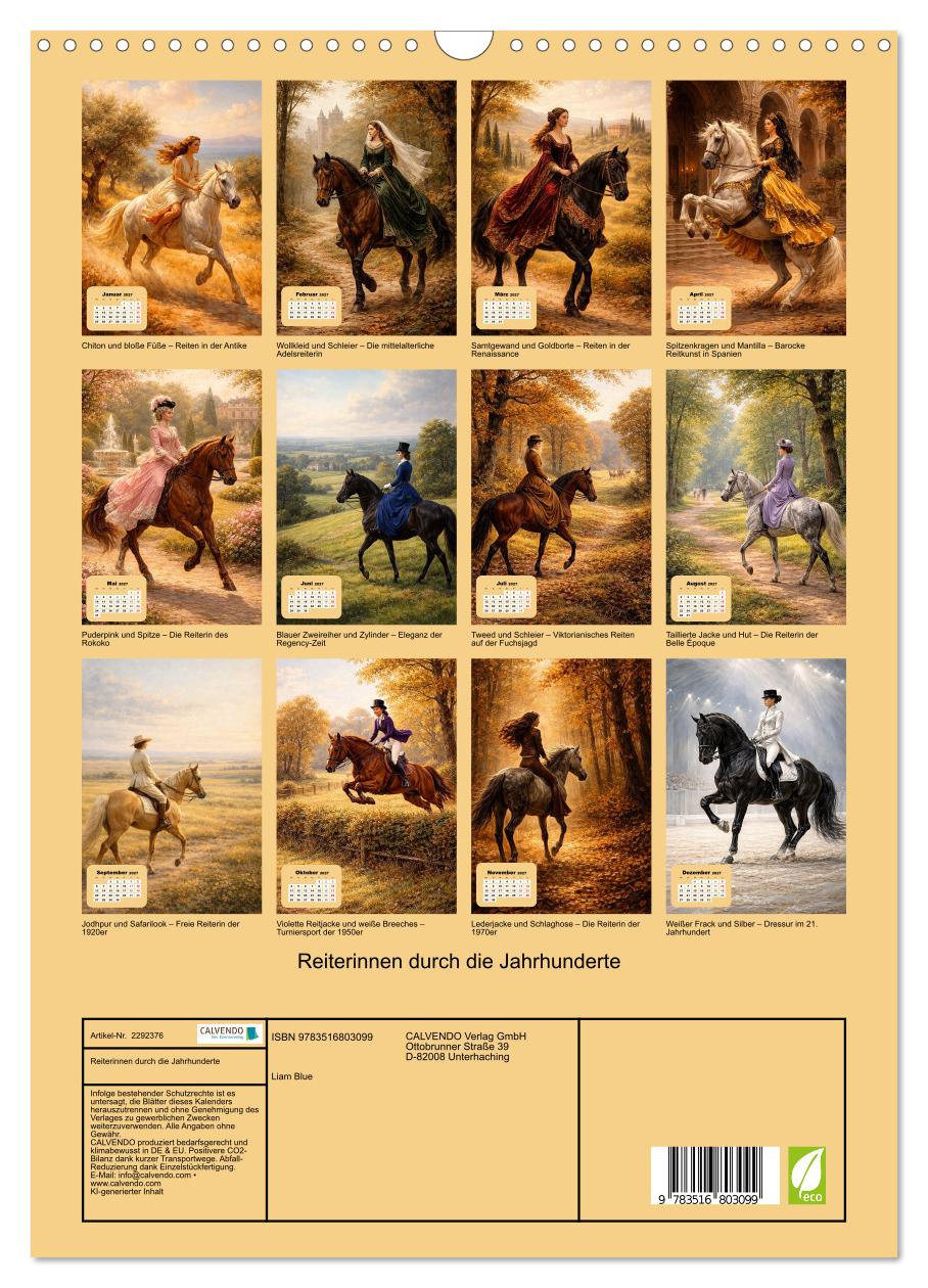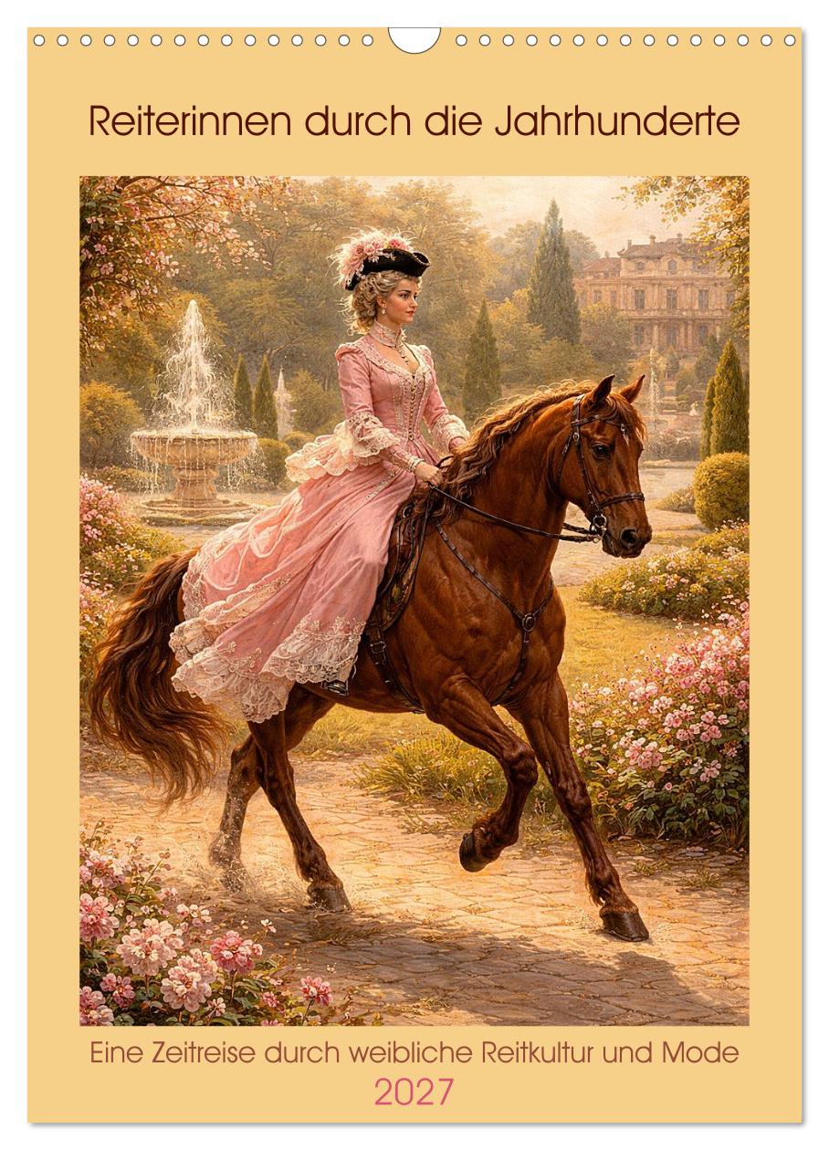 Vom antiken Griechenland bis zur modernen Dressuranlage — dieser Wandkalender nimmt Pferdeliebhaberinnen und Modebegeisterte mit auf eine faszinierende Reise durch 2500 Jahre weiblicher Reitkultur. Jedes Bild zeigt eine Reiterin in Kleidung angelehnt an die Mode ihrer Epoche: der fließende Chiton der Antike, der schwere Samt der Renaissance, die elegante Reitstunde im Rokoko-Schlosspark, der taillierte Zweireiher der Belle Époque bis hin zum strahlend weißen Frack der Dressur-Champions von heute. Gemalt im Stil klassischer Ölgemälde entfaltet jede Szene eine eigene Farbwelt und eine ganz eigene Geschichte. Für alle, die Pferde, Geschichte und Mode lieben. KI-generiert.