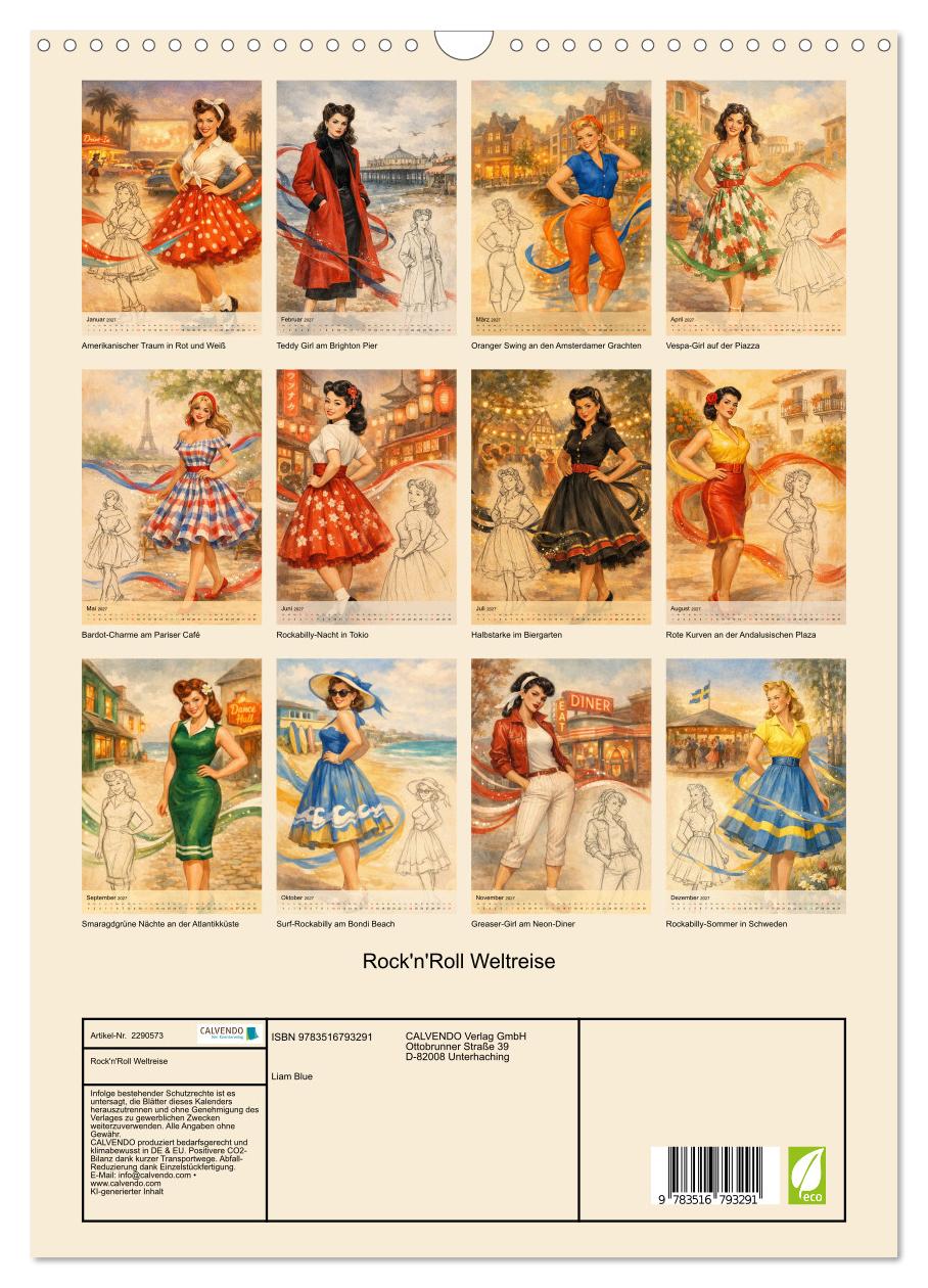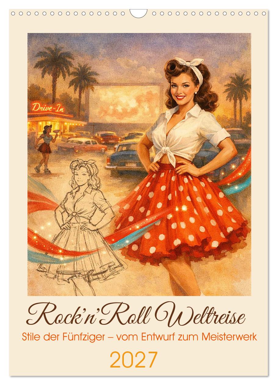 Der Rock’n’Roll der 1950er Jahre kleidete sich in jedem Land anders – und dieser KI-generierte Wandkalender macht genau das sichtbar. Jeder Monat zeigt eine Frau im unverwechselbaren nationalen Stil ihrer Zeit: als zarter Bleistiftentwurf und als leuchtend ausgemalte Vollendung in den Landesfarben. Von der Teddy Girl an Englands windiger Küste über die Rockabilly-Nacht in Tokio bis zur eleganten Spanierin im Pencil Skirt – angelehnt an Mode, Kulissen und Energie der Fünfziger. Die Verwandlung vom Modeentwurf zum Meisterwerk macht jeden Monat zum Erlebnis. Für alle, die Retro-Mode, Vintage-Illustration und die Kraft der Fünfziger lieben.
