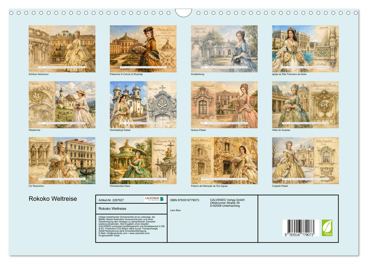 Begeben Sie sich auf eine faszinierende Reise zu zwölf der schönsten Rokoko-Bauwerke der Welt. Dieser KI-generierte Kalender vereint architektonische Meisterwerke aus vier Kontinenten mit der Eleganz des 18. Jahrhunderts. Von Preußens Sanssouci über Russlands azurblauen Katharinenpalast bis zum goldenen Prunk des türkischen Dolmabahçe-Palastes – jeder Monat präsentiert ein neues architektonisches Juwel. Historische Architekten-Skizzen geben Einblick in die Baukunst vergangener Tage, während prächtig gekleidete Damen in opulenten Rokoko-Gewändern die Pracht ihrer Zeit zum Leben erwecken. Entdecken Sie versteckte Perlen wie die brasilianische Kirche São Francisco in Ouro Preto oder das verspielte Chinesische Haus bei Potsdam.