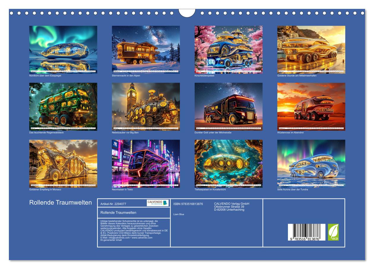 Ein barocker Palast gleitet über das Mittelmeer, ein leuchtendes Unterwassergrotto taucht in die Tiefsee und ein dunkler Stahlkoloss thront unter der Milchstraße — Rollende Traumwelten entführt in eine Welt, in der Luxuswohnmobile jede erdenkliche Grenze sprengen. Von der vereisten Arktis über japanische Kirschgärten bis zum neongetränkten Tokio bei Mitternacht: zwölf außergewöhnliche Fahrzeuge erkunden Orte jenseits aller Vorstellungskraft. KI-generierte Illustrationen im Stil von Gustave Doré und Syd Mead verbinden märchenhafte Opulenz mit futuristischer Vision — ein Jahresbegleiter für alle, die Reisen als Kunst verstehen und vom großen Aufbruch träumen.