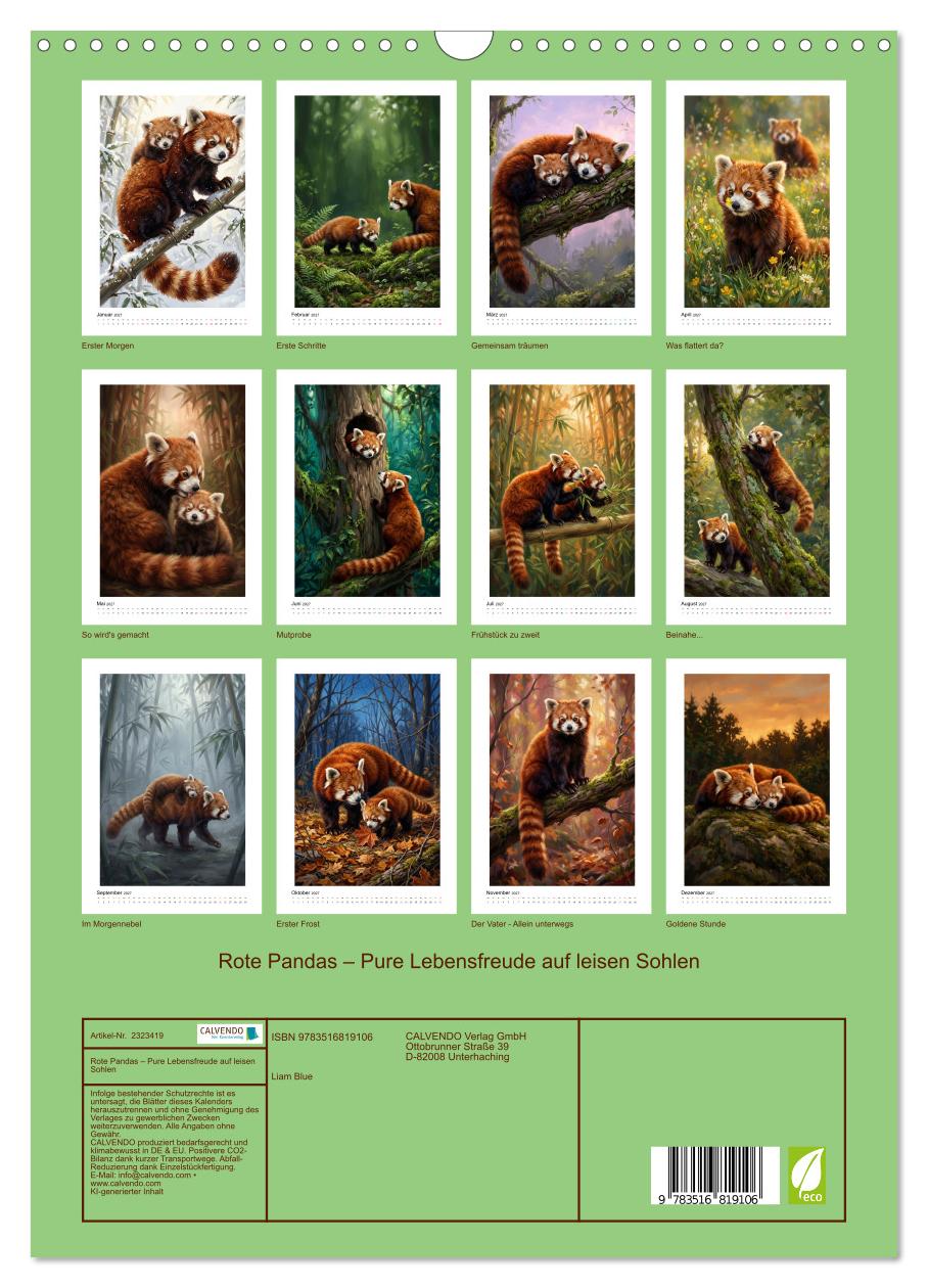 Rote Pandas gehoeren zu den geheimnisvollsten Waldbewohnern des Himalaya. Mit ihrem leuchtend rostrot-braunen Fell, den geringelten Schwänzen und den markanten Gesichtszeichnungen sind sie unverwechselbar – und nur selten zu beobachten. Dieser Kalender begleitet eine Mutter und ihr Jungtier durch die Jahreszeiten: von den ersten zögerlichen Schritten im Moos über neugierige Begegnungen mit Schmetterlingen bis zum ruhigen Abendsonnenlicht im Dezember. Malerisch angelehnt an fotorealistische Naturaufnahmen, KI-generiert im impressionistischen Illustrationsstil. Zwölf stille Momente, die das Herz berühren.