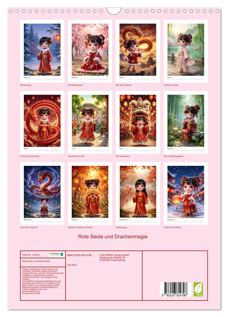 Rote Gewänder, goldene Haarnadeln und ein Hauch von Drachenmagie – diese zwölf kleinen Festtagsmädchen nehmen Kinder und die ganze Familie mit in eine Welt angelehnt an die Feste und Märchen des alten China. Jedes Bild zeigt eine bezaubernde Chibi-Puppe in ihrem ganz eigenen Abenteuer: mal tanzt sie im Schnee vor einem erleuchteten Tempeltor, mal steht sie staunend unter einem riesigen roten Drachen, mal lacht sie beim Löwentanz oder hält inne im stillen Bambusgarten. KI-generierte Illustrationen im hyperrealistischen 3D-Stil mit glänzenden Augen und weichen Farben – traumhaft schön für Kinderzimmer und Wohnräume.