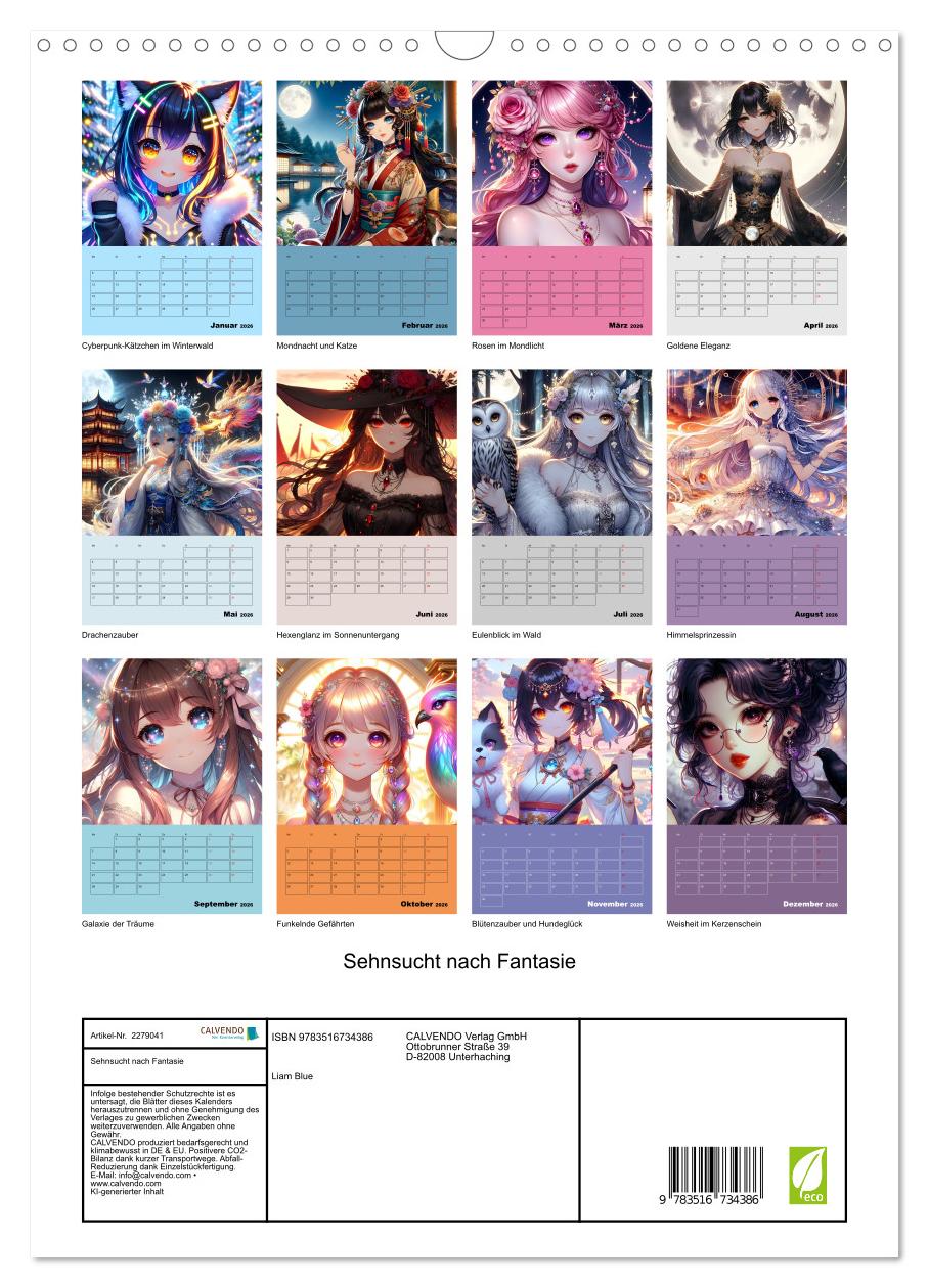 Lassen Sie sich jeden Monat aufs Neue inspirieren von „Sehnsucht nach Fantasie“. Dieser einzigartige, KI-generierte Kalender entführt Sie in magische Welten voller träumerischer Anime-Charaktere, meisterhaft in Szene gesetzt zwischen Natur, Magie und Cyberpunk. Die Bilder bestechen durch ihre feinen Details, bezaubernde Farben und einen kunstvollen Stil, der Freude und Staunen weckt. Ideal für Fans von Anime, Ästhetik und digitaler Kunst – ein visuelles Erlebnis mit raffinierter Motivauswahl und emotionalen Momenten, das Ihren Alltag mit Fantasie und Zauber bereichert.
