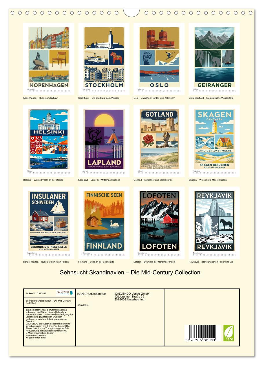 Entdecken Sie den Norden durch die Augen einer vergangenen Ära. Dieser Kalender ist eine Hommage an das goldene Zeitalter des Reisedesigns und präsentiert Skandinavien in der unverwechselbaren Ästhetik der 1950er-Jahre. Inspiriert von fiktiven Dachbodenfunden, vereinen die Motive die klaren Linien des nordischen Modernismus mit der Wärme klassischer Siebdruckkunst. Von den bunten Häfen Kopenhagens über die majestätischen Fjorde Norwegens bis hin zu den endlosen Seen Finnlands – jedes Blatt erzählt eine eigene kleine Reisegeschichte. Die Bilder wurden aufwendig KI-generiert und sind künstlerisch an historische Reiseplakate angelehnt. Ein nostalgisches Must-have für Design-Liebhaber und Skandinavien-Fans, das zeitlose Eleganz an jede Wand bringt.