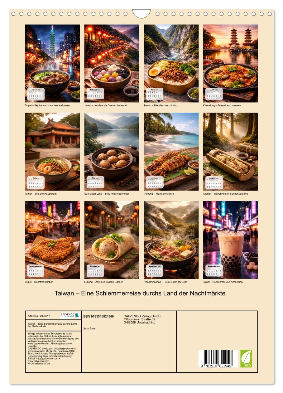 Neonlichter, dampfende Garküchen und der Duft von frisch gebratenem Streetfood – Taiwan ist ein Paradies für Genießer. Dieser KI-generierte Wandkalender entführt dich auf eine kulinarische Reise durch das Land der Nachtmärkte: von dampfender Rindernudelsuppe vor der Skyline von Taipei über knuspriges Streetfood im Shilin Night Market bis hin zu traditionellen Spezialitäten in historischen Städten. Zwölf faszinierende Orte, zwölf authentische Gerichte und eine einzigartige Mischung aus moderner Metropole, uralter Kultur und spektakulärer Natur. Jeder Monat ist eine Einladung, Taiwan mit allen Sinnen zu entdecken.