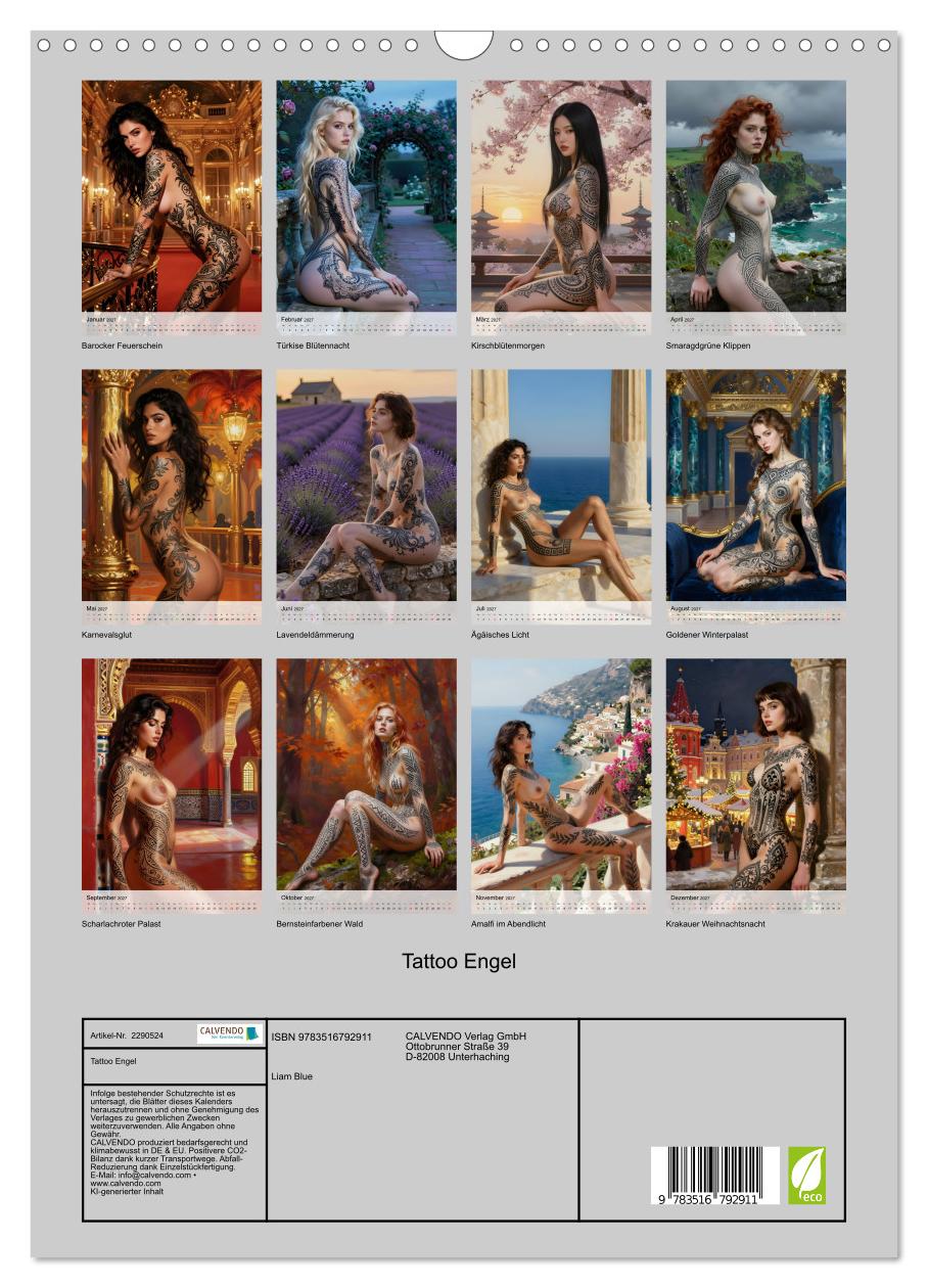 Zwölf verführerische Schönheiten aus aller Welt – jede eine Göttin, jede ein Kunstwerk. Dieser KI-generierte Wandkalender verbindet klassische Ölmalerei mit der faszinierenden Ästhetik ornamentaler Tätowierungen: Schwarze Filigranmuster, keltische Flechtwerke, byzantinische Ornamente und gotische Kathedralmotive bedecken die Körper dieser sinnlichen Frauen von Kopf bis Fuß. Jeder Monat entführt in eine andere farbprächtige Welt – vom goldenen Barockballsaal über türkisblaue Klippenküsten bis zum glühenden Weihnachtsmarkt im Schnee. Die Tattoos bleiben stets klassisch schwarzgrau; die Farbe gehört dem Umfeld, das jede Frau wie ein lebendiges Gemälde einrahmt. Für alle, die Tattoo-Kunst, weibliche Sinnlichkeit und malerische Ästhetik lieben.