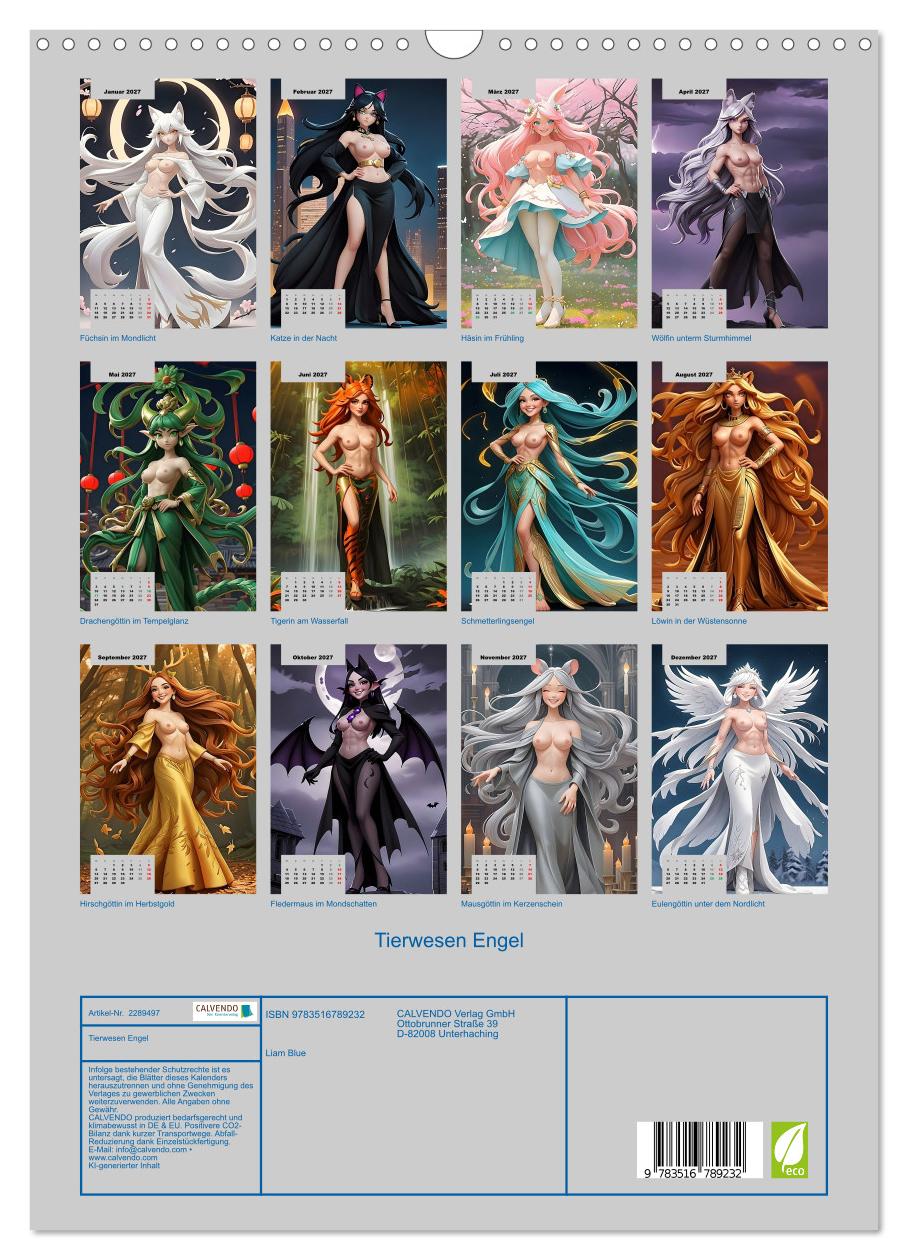 Zwölf unwiderstehliche Tierwesen-Göttinnen im unverwechselbaren Stil des klassischen Anime. KI-generiert und doch fast handgemalt – jedes Bild erinnert an die goldene Ära japanischer Animationskunst mit satten Farben, weichen Linien und dramatisch wehendem Haar. Füchsin, Löwin, Wölfin und neun weitere kurvige Göttinnen präsentieren sich oben ohne in magischen Welten – vom mondbeleuchteten Kirschblütengarten über die ägyptische Wüste bis zum gotischen Schloss im Mondschein. Jeder Monat zeigt eine andere Farbwelt, ein anderes Setting, eine andere verführerische Persönlichkeit. Für alle die klassische Anime-Ästhetik, üppige Kurven und freizügige Fantasiekunst lieben.