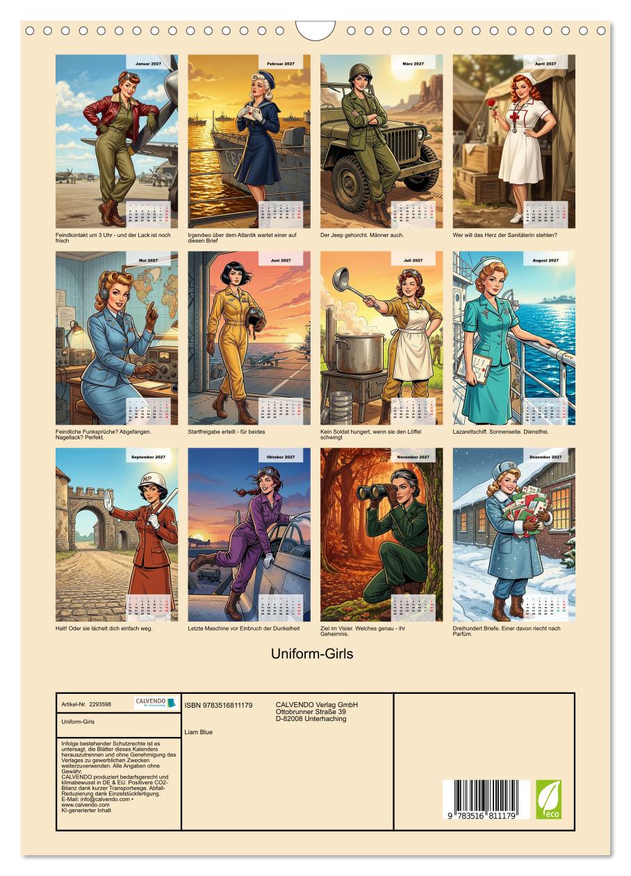 Habt Acht – und Augen auf! Diese zwölf Damen haben sich freiwillig gemeldet und machen dabei eine verdammt gute Figur. Von der Pilotin im Bomberjacken-Rot bis zur Sanitäterin im tadellosen Weis mit rotem Kreuz: Uniform-Girls entfuhrt in die glamourose Welt des amerikanischen Militar der 1940er Jahre – angelehnt an die legendaren Pinup-Motive, die einst Bomberstaffeln und Barackenwande schmuckten. KI-generiert im klassischen Illustrationsstil trifft hier knackige Uniform auf rote Lippen, Stahlhelm auf Victory Rolls und Dienstvorschrift auf unwiderstehlichen Charme. Fur Pinup-Liebhaber, Nostalgie-Fans und alle, die wissen: Stil ist die beste Uniform.