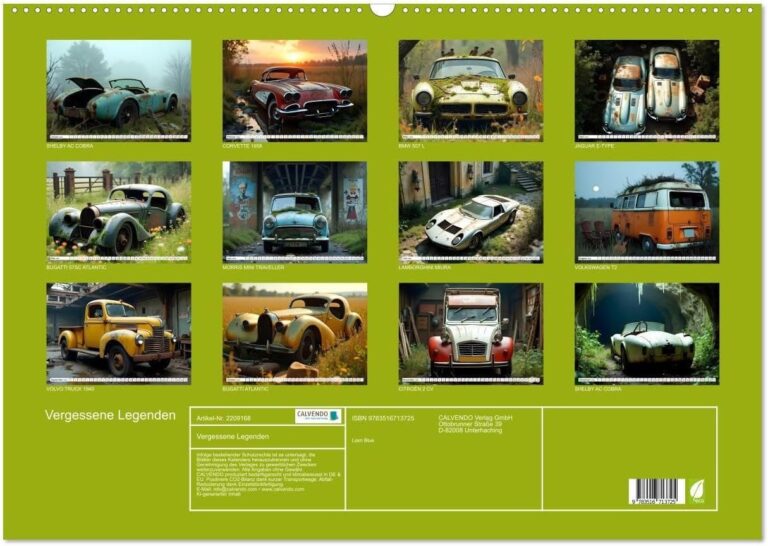 Entdecken Sie mit „Vergessene Legenden“ eine faszinierende Bilderreise durch die stille Welt verlassener Oldtimer. Jede Aufnahme zeigt einen einzigartigen Klassiker, gezeichnet von Zeit, Natur und Wetter, und erzählt von einstigem Glanz, Abenteuern und Sehnsucht. Diese KI-generierten Motive verbinden kunstvollen Verfall mit nostalgischer Automobileleganz. Für jeden Liebhaber alter Fahrzeuge und authentischer Bildästhetik ist dieses Werk eine inspirierende Hommage an das, was überdauert. Lassen Sie sich Monat für Monat von neuem überraschen und träumen Sie sich in vergangene Zeiten zurück.
