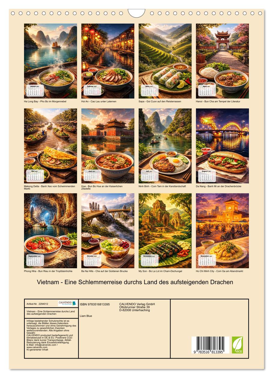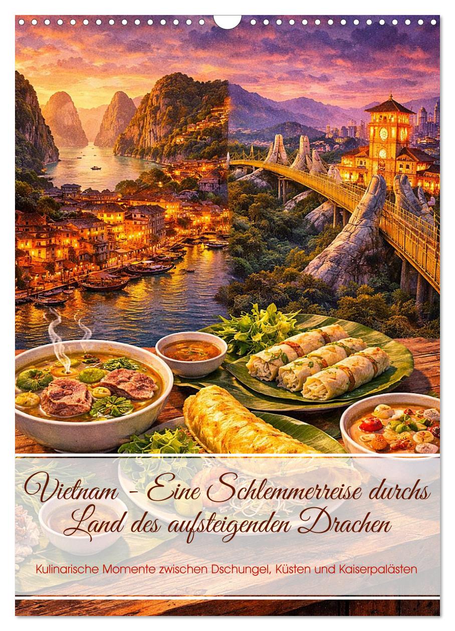 Von den Karstfelsen der Ha Long Bay bis zum pulsierenden Ben Thanh Markt in Ho Chi Minh City – Vietnam ist ein Land, das alle Sinne gleichzeitig betört. Dieser Kalender verbindet die spektakulärsten Sehenswürdigkeiten des Landes mit den Gerichten, die sie unvergesslich machen: dampfende Pho vor nebligen Wasserwegen, knusprige Banh Xeo am Mekong, gegrilltes Fleisch in Betelblättern vor uralten Cham-Ruinen im Dschungel. KI-generierte Illustrationen im warmen Reiseposter-Stil nehmen den Betrachter mit auf eine Reise durch Reisterrassen, Tropfsteinhöhlen, Kaiserpaläste und leuchtende Laternen-Altstädte – und lassen das Wasser im Mund zusammenlaufen.