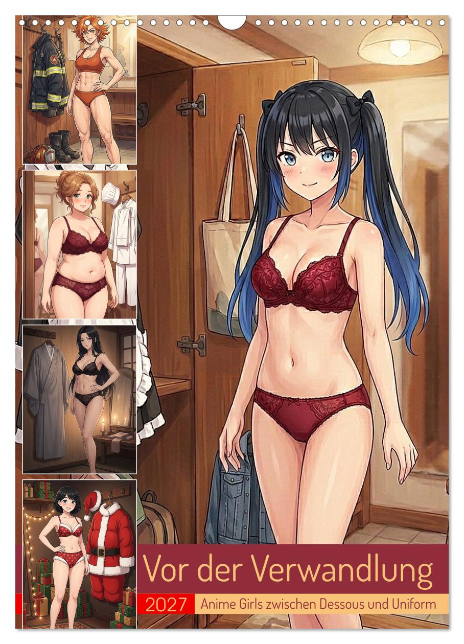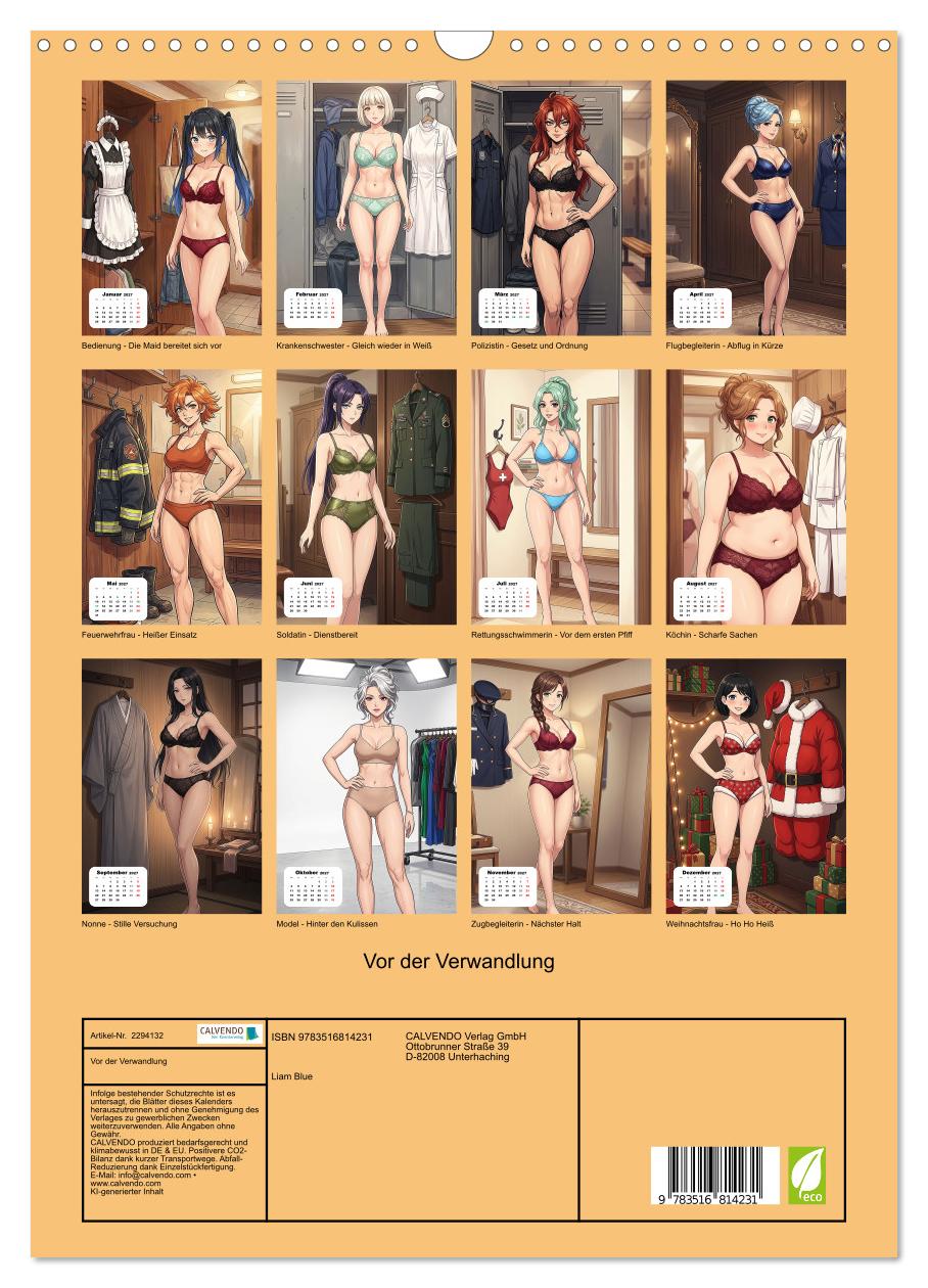 Hast du dich eigentlich schon immer gefragt, was die Polizistin unter ihrer Uniform trägt? Oder was die Stewardess anlegt bevor sie zum Dienst erscheint? Dieser Kalender gibt die Antwort – Monat für Monat. Zwölf Frauen, zwölf Berufe, ein einziger privater Moment bevor der Alltag beginnt. Die Uniform hängt bereit, die Frau dahinter steht davor – und was sie trägt verrät mehr über sie als jede Berufsbezeichnung es könnte. Sportlich-knapp bei der Feuerwehrfrau, elegant-seidig bei der Stewardess, verführerisch-verspielt bei der Maid. KI-generierte Anime-Illustrationen für alle, die schon immer neugierig waren.