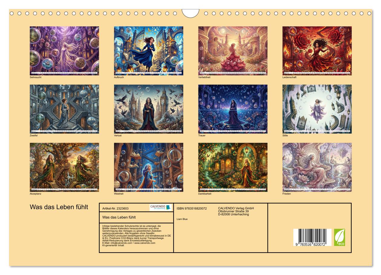 Sehnsucht sieht anders aus als Verlust. Leidenschaft baut andere Welten als Stille. Dieser außergewöhnliche Wandschmuck zeigt zwölf surreale Universen, die jeweils ein großes menschliches Gefühl sichtbar machen – und eine Frau, die durch alle diese Welten wandert, von der ersten Sehnsucht der Jugend bis zum tiefen Frieden des Alters. Jedes Bild ist ein Wimmelbild voller Symbole, Architekturen, Lichter und Geheimnisse, die man immer wieder neu entdeckt. Die schwebenden Blasen spiegeln, was innen vorgeht. Die Welten wachsen aus dem Gefühl heraus. Die Frau ist dieselbe – und doch jedes Mal eine andere. Alle Bilder wurden aufwendig KI-generiert und sind angelehnt an die große Tradition surrealistischer Traumkunst.