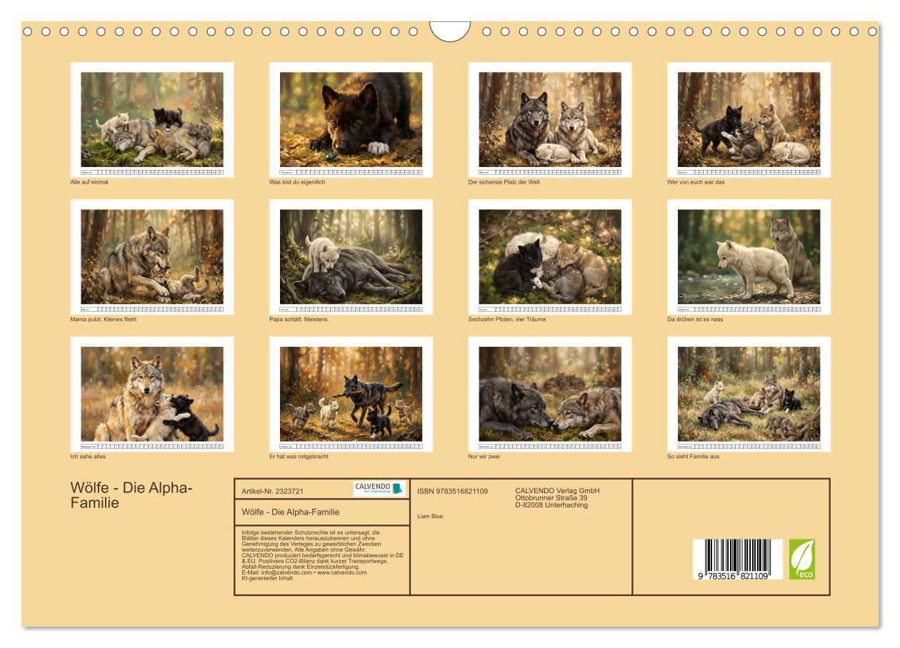Kein Wolf posiert hier. Keiner heult zum Mond. Die Alpha-Familie hat Besseres zu tun: Die Welpen nerven die Mutter, der Vater schläft mit einem Kleinen auf dem Kopf, und der weißeste Welpe des Wurfs traut sich einfach nicht über den Bach. Dieser KI-generierte Wandkalender zeigt einen einzigen ruhigen Waldnachmittag aus der Perspektive stiller Beobachter – nah dran, ohne aufzuschrecken. Sechs Charaktere, zwölf Momente, eine Welt aus warmem Sonnenlicht, Moos und dem ganz normalen Wahnsinn einer Wolfsfamilie. Angelehnt an die impressionistische Wildtierillustration mit weichen Pinselstrichen, warmen Erdtönen und echtem Charakter. Für alle, die Wölfe lieben und wissen: Das Schönste passiert immer zwischen den großen Momenten.