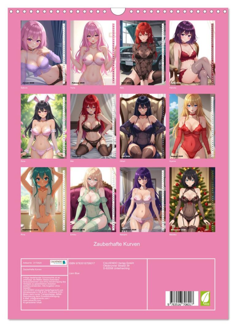 Erfülle dir deine Fantasien mit „Zauberhafte Kurven – Sexy Anime Mädchen zum Träumen“. Zwölf KI-generierte Kalenderbilder zeigen erotische Anime-Girls in reizvoller Lingerie, inspiriert von japanischen Traumwelten und sinnlicher Schönheit. Jede Seite verführt mit verlockenden Kurven, durchscheinenden Dessous und geheimnisvollen Namen wie Sakura, Haruka oder Mei. Ein einzigartiger Kalender für alle, die von Anime-Kunst, Erotik und weiblicher Anmut träumen.